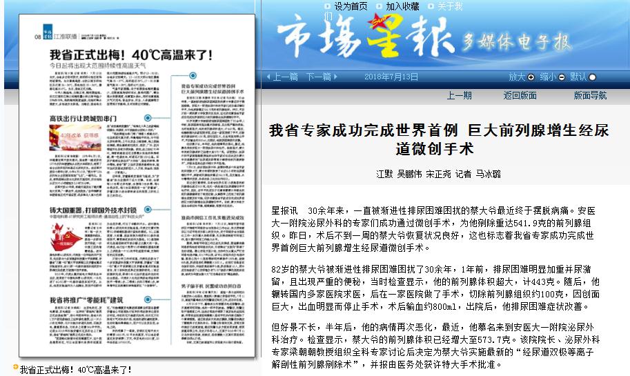 市场星报:我省专家成功完成世界首例 巨大前列腺增生经尿道微创手术