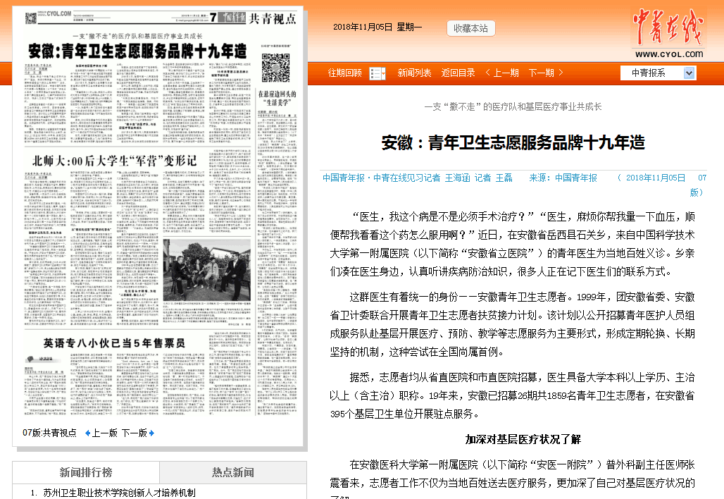 这群医生有着统一的身份——安徽青年卫生志愿者。1999年,团安徽省委、安徽省卫计委联合开展青年卫生志愿者扶贫接力计划。该计划以公开招募青年医护人员组成服务队赴基层开展医疗、预防、教学等志愿服务为主要形式,形成定期轮换、长期坚持的机制,这种尝试在全国尚属首例。