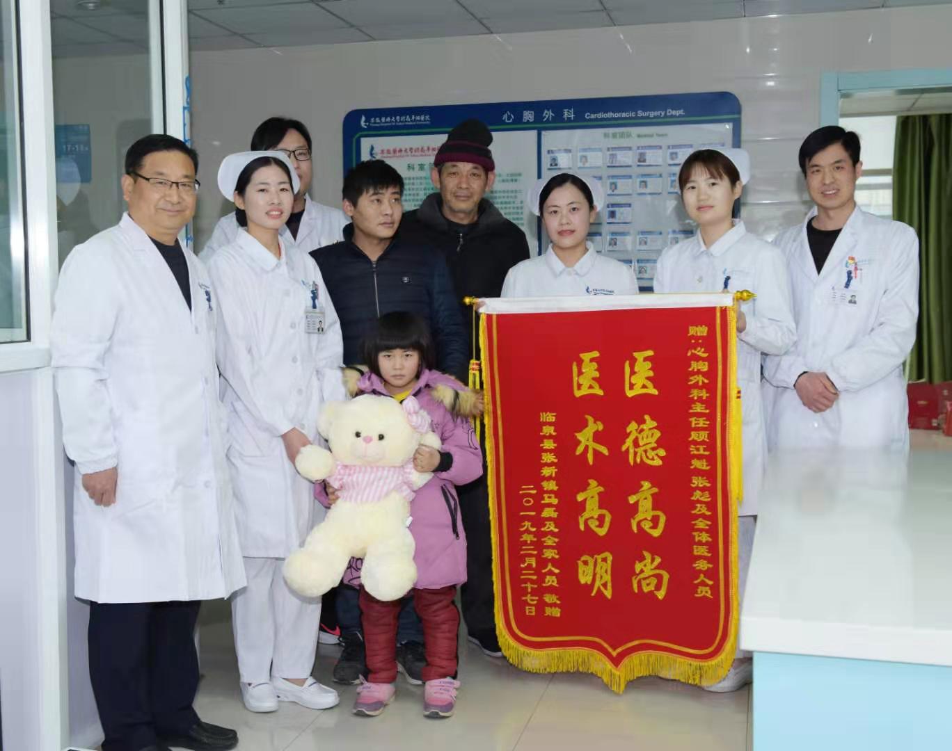 “医德高尚  医术高明”,玲玲的家人给心胸外科送来了锦旗,以示感谢。就要回家了,此刻的玲玲甭提多高兴啦!一朵随时可“凋零”的小花,今天重又绽放出生命的精彩! (魏振强 通讯员:鲁胜利)