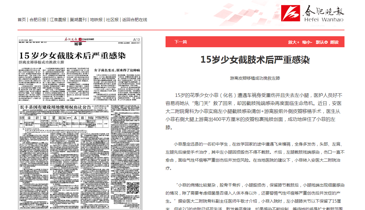 小菲是定远县的一名初中学生,在放学回家的途中遭遇飞来横祸,全身多发伤,头部、左肩、左腿先后接受手术治疗,其中左小腿因损毁伤不得不截肢。术后,左腿截肢残端感染,伤口一直不愈合,面临气性坏疽等严重创伤后并发症风险。在当地医院的建议下,小菲转入安医大二附院治疗。