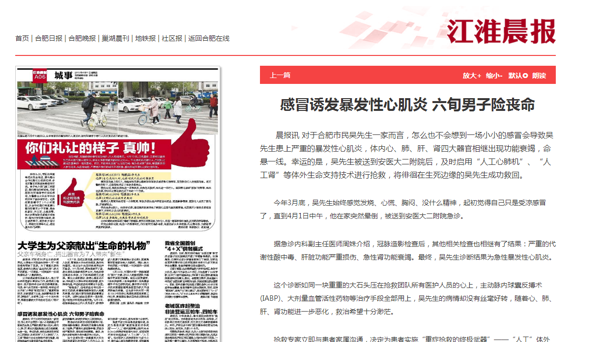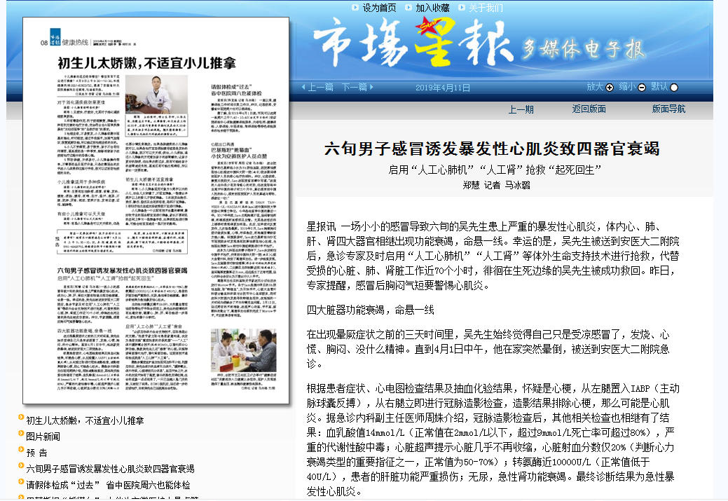 新安晚报/安徽商报/市场星报/江淮晨报/:感冒诱发暴发性心肌炎 六旬男子险丧命