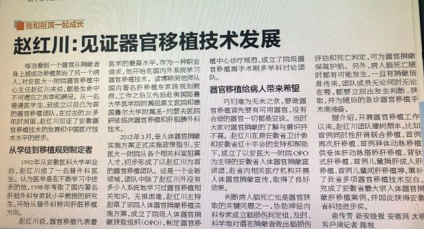 新安晚报、安徽网、大皖客户端讯 每当看到一个器官从捐献者身上被成功移植救治了另一个病人,对安医大一附院器官移植中心主任赵红川来说,都是生命中不可遗忘之庆幸和满足。从一名普通医学生,到成立以自己为首的器官移植团队,在过去的20 多年时间里,赵红川见证了安徽器官移植技术的发展和中国医疗技术水平的进步。
