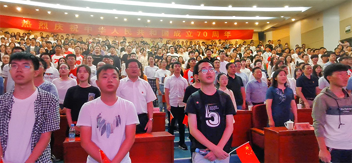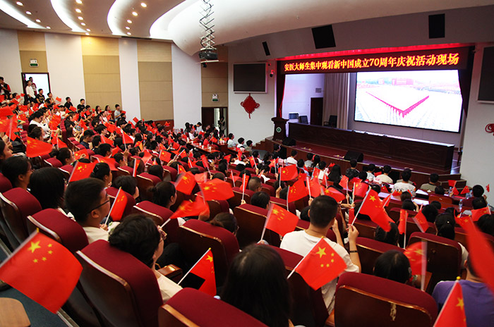 上午10时,当电视画面出现习近平等党和国家领导人登上天安门城楼时,伴着70响礼炮轰鸣,报告厅里响起了热烈掌声。当义勇军进行曲响起时,全体师生庄严肃立,共唱国歌,仿佛置身于盛典现场。当习近平总书记在讲话中高呼:“伟大的中华人民共和国万岁!伟大的中国共产党万岁!伟大的中国人民万岁!”现场沸腾了,雷鸣般的掌声经久不息。