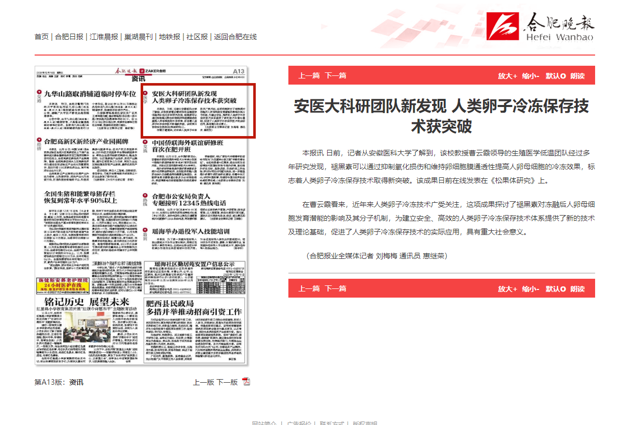 合肥晚报:安医大科研团队新发现 人类卵子冷冻保存技术获突破