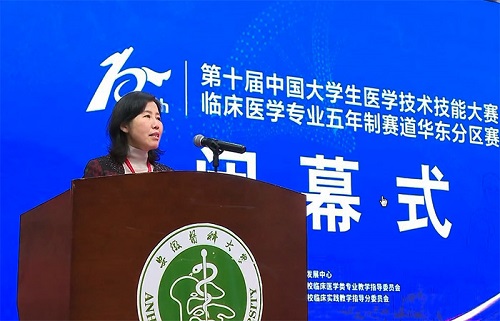 曹云霞在致辞中代表学校,向为大赛辛勤付出的裁判员、专家表示诚挚敬意,向取得优异成绩的代表队表示热烈祝贺,向关心和支持大赛的各高校师生、志愿者和工作人员表示衷心感谢。她指出,此次华东分区赛高规格、高质量、高水平,参赛选手们精神饱满、水平精湛,裁判员专家科学严谨、公正评判,场内外氛围浓厚、秩序井然,大家切磋了技艺、展示了水平,也凝聚了共识、深化了友谊。各代表队通过比赛充分汲取了先进经验,深入挖掘短板不足,相互传经送宝,为各校深化临床实践教学改革、提高临床教育教学质量明确了方位、锚定了方向、提供了借鉴。曹云霞希望同学们牢记“健康所系、性命相托”的医学生誓言,恪守医德、刻苦钻研,勤练技能、精益求精,从比赛中充分汲取养分,不断提高综合素养和实践能力,早日成为德技双馨的医学人才。希望广大医学教育工作者不忘立德树人初心,牢记为党育人、为国育才使命,修医德、行仁术,怀救苦之心、做苍生大医,写好治病救人、教书育人“两本书”,努力为国家培养更多优秀的医学人才,为人民提供更加优质的健康服务,为卫生健康事业作出新的贡献。