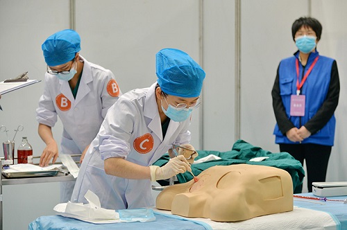 本次竞赛分初赛、复赛、半决赛、决赛四个部分,分别采用多站式、赛道式、单站式进行,考核内容覆盖内科、外科、妇产科、儿科、急诊医学、感染病学、诊断学、基础护理学等临床多个学科,均采用仿真模拟教学模型和标准化病人,高度贴近真实临床情景,以此全面考核医学生的素质、知识、能力以及医学人文和团队合作精神。
