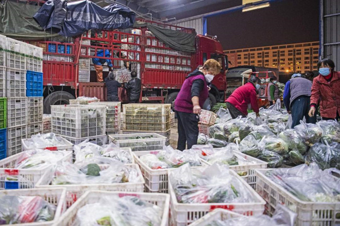 3月30日晚,中垦流通·滁州国际农产品物流园,工人们正在将蔬菜打包装车。计成军 摄