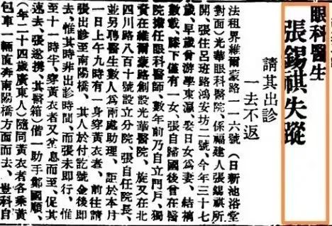 1934年9月5日《新闻报》刊发的消息《眼科医生张锡祺失踪》