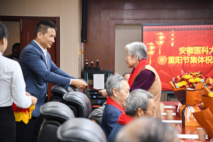 王琦代表学校向今年满80周岁的老同志们送上诚挚的祝福,通过他们向全校的离退休老同志致以崇高的敬意和问候。他对老同志们长期以来为学校建设发展贡献的智慧力量、倾注的辛勤汗水表示衷心感谢,并向他们介绍了学校2024年以来取得的发展成就。他说,2024年以来,全校上下深入学习贯彻习近平新时代中国特色社会主义思想和党的二十届三中全会精神,全面贯彻落实党的二十大战略部署,新医科中心(新校区)提前启用,在校生考研率、就业率、获奖数等核心指标稳步提升,一批提升学校综合治理能力的新举措正加紧筹备落地。学校社会影响力和办学美誉度不断提高,一流医科大学建设正迈出坚实步伐。王琦还引用习近平总书记给“银龄行动”老年志愿者的回信,希望我校广大老同志保持老骥伏枥、老当益壮的健康心态和进取精神,既老有所养、老有所乐,又老有所为,为学校的高质量发展贡献“银发力量”。